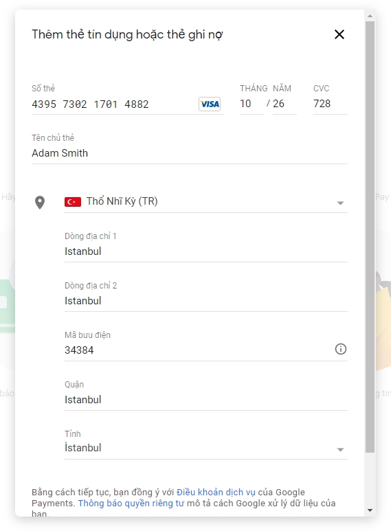 Tại bảng hộp thoại hiện ra, bạn click vào dòng địa chỉ và chọn Quốc gia là Thổ Nhĩ Kỳ; Sau đó điền các thông tin như hình bên dưới:
